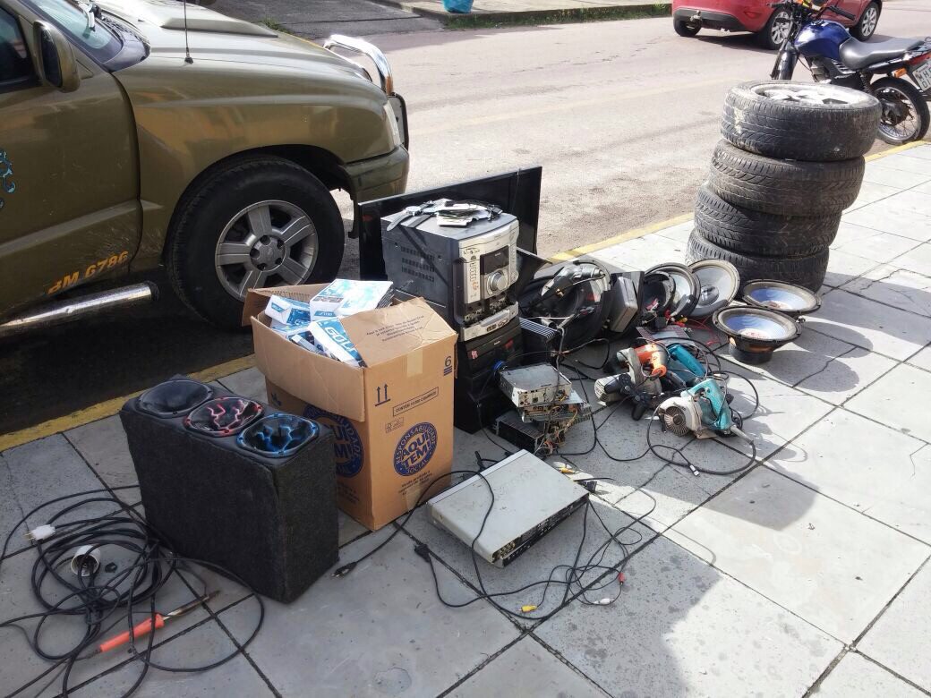 Nesta residência foram encontrados diversos objetos sem procedência como rádios de veículos, televisão 32 polegadas, aparelhos de som, furadeira, plaina, outras ferramentas diversas e 6 gaiolas com animais exóticos e silvestres, outros objetos que foram apreendidos e 26 documentos CRLV de vários veículos.