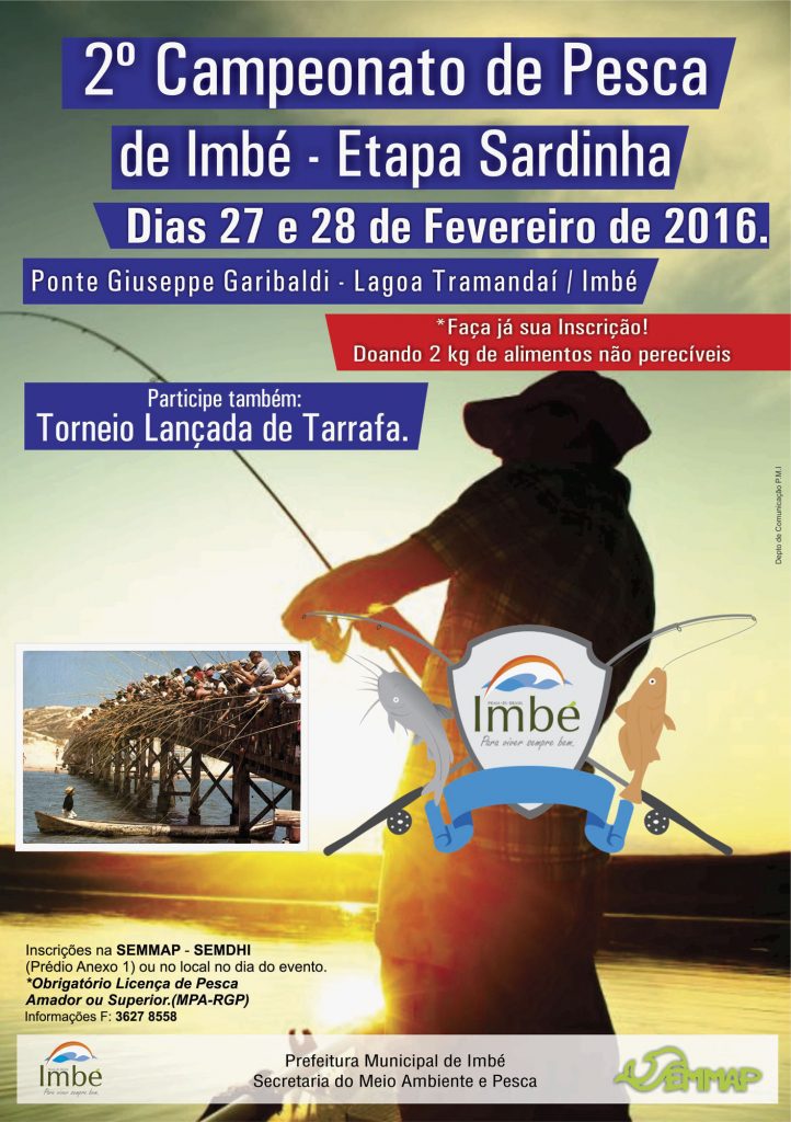 A Prefeitura Municipal de Imbé através da Secretaria de Meio Ambiente e Pesca Imbé Pesca (SEMMAP) realizará neste final de semana (dias 27 e 28 de fevereiro) o 2º Campeonato de Pesca de Imbé – Etapa Sardinha. O evento ocorrerá na Ponte Giuseppe Garibaldi.