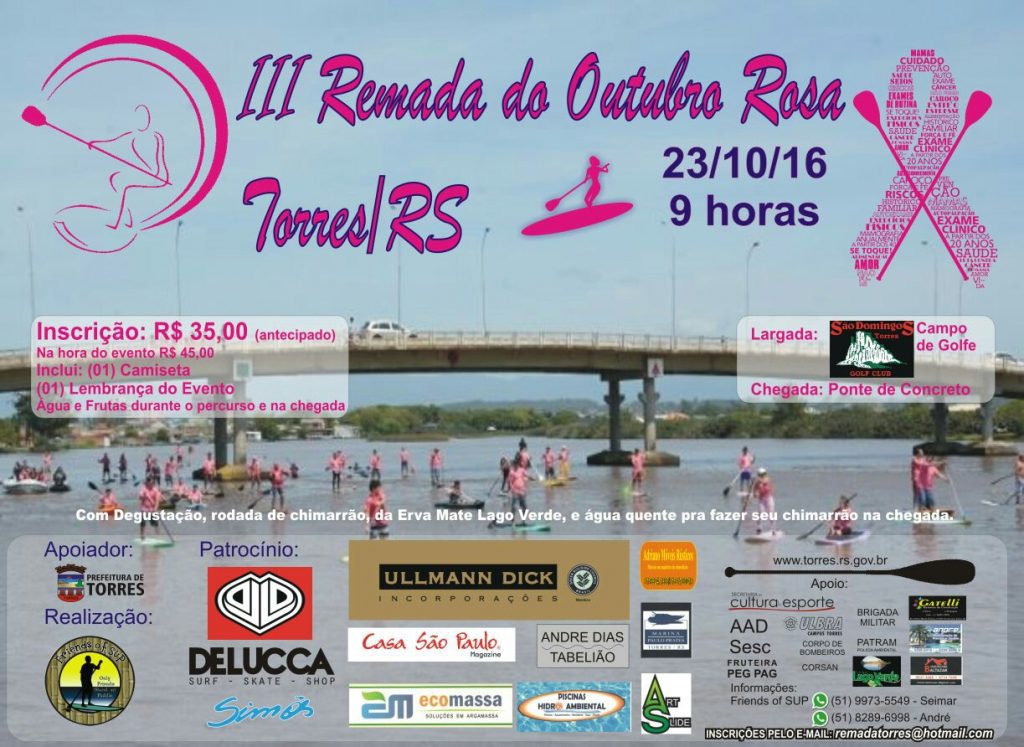 Neste domingo, 23 de outubro, será realizada a 3ª Remada Outubro Rosa Torres 2016, atividade integrante da programação mensal que visa divulgar a prevenção do câncer de mama. O evento acontece nas margens do Rio Mampituba, com saída em frente ao Campo do São Domingos Torres Golfe e chegada entre a Ponte Pênsil e a Ponte de Concreto.