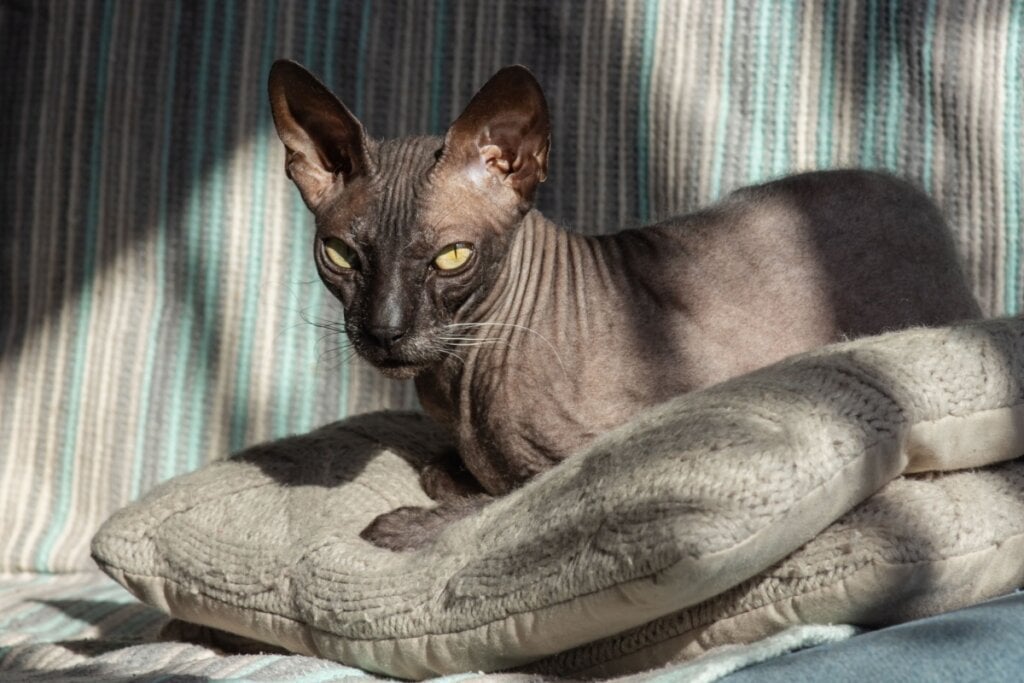 Outro ponto importante é a sensibilidade térmica. Sem uma camada de pelos para protegê-lo, o donskoy sente frio com facilidade e pode sofrer com temperaturas extremas. Por isso, é essencial manter o ambiente sempre aquecido no inverno e protegê-lo do sol intenso no verão, pois sua pele pode queimar facilmente.