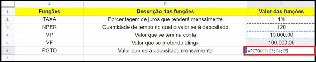 Por exemplo: para descobrir o PGTO, é preciso utilizar informações de outras 4 funções. Isto é, para calcular o quanto uma pessoa deverá depositar mensalmente (PGTO) em uma aplicação, é preciso ter outras informações, como: