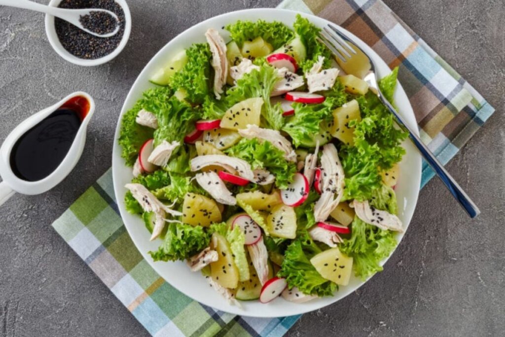 Em um recipiente, coloque as folhas de alface, o rabanete, o pepino e o abacaxi e misture. Acrescente o frango e tempere com suco de limão, azeite, sal e pimenta-do-reino. Para finalizar, salpique com as sementes de chia. Sirva em seguida.