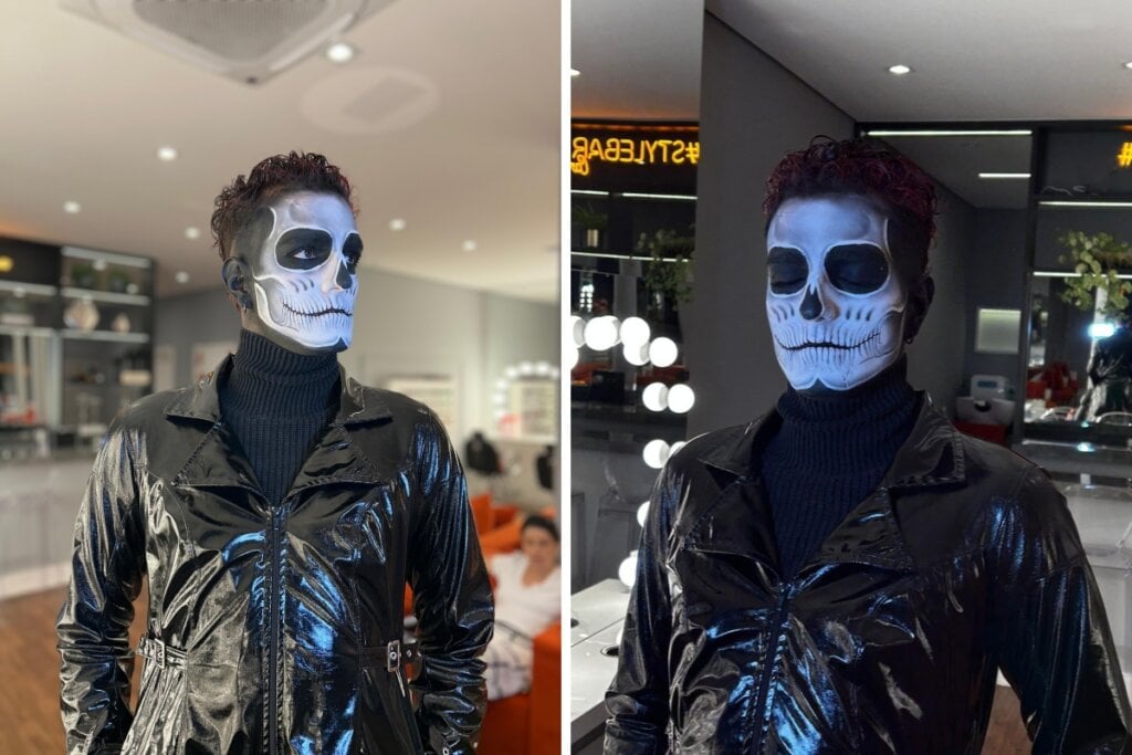 O clássico esqueleto é uma das opções mais versáteis e populares para o Halloween, especialmente para quem busca algo que seja um pouco mais elaborado. Segundo Gisela Prochaska, essa maquiagem é ideal para quem quer um look impactante sem precisar de muitos produtos. Usando apenas preto e branco, é possível criar um efeito de caveira incrivelmente expressivo, que destaca os contornos naturais do rosto de maneira dramática.