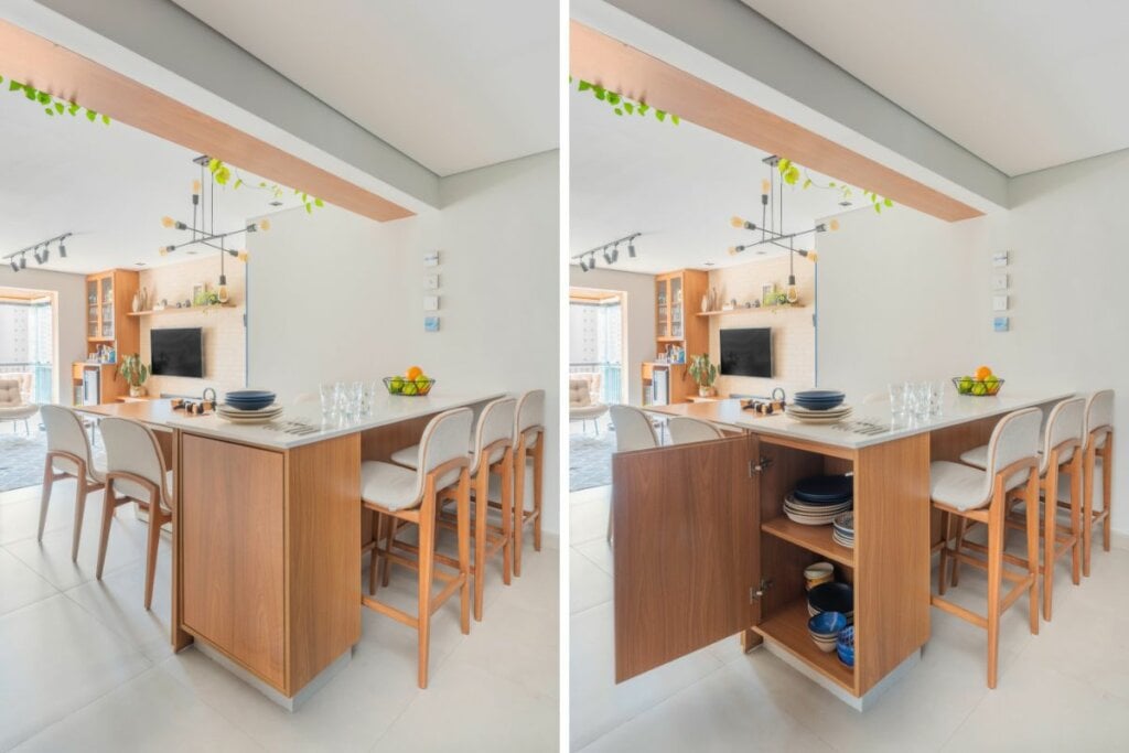 Em áreas mais amplas, ele afirma que o projeto permite apostar nas tradicionais portas de abrir. No entanto, recomenda que seja feita uma medição prévia, já considerando o espaço necessário para a abertura total da folha — uma precaução que evita erros no dimensionamento de móveis. “Para ambientes maiores, inclusive, é possível combinar os dois modelos de armários, de acordo com o estilo e a preferência do morador”, sugere o especialista.