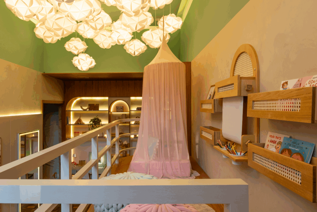 Espaço limitado pode ganhar novas camadas com a criação de um mezanino lúdico. A estrutura elevada funciona como refúgio simbólico e área de leitura, com estantes, tapetes e almofadas. A verticalização otimiza a metragem e propõe um novo olhar para o ambiente.