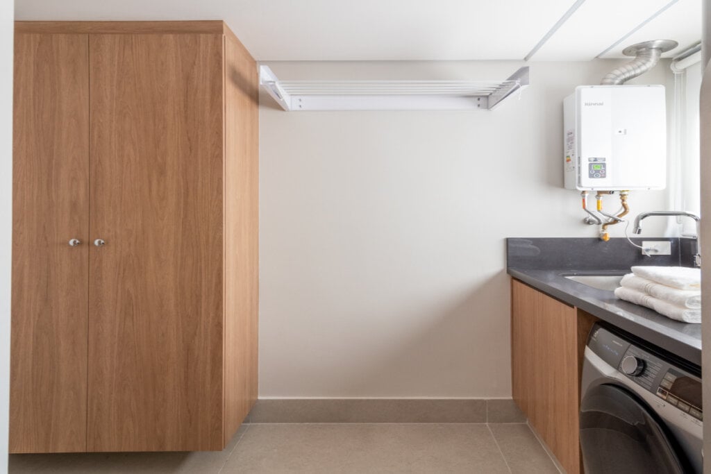 “Sem contar que o tipo de luminária não deve interferir na movimentação do varal ou na abertura das portas dos armários”, adverte. Por fim, a ventilação natural é indicada tanto para a secagem das roupas (se possível, instale o varal com as hastes no sentido do vento) como para a segurança no caso de aquecedores de passagem.