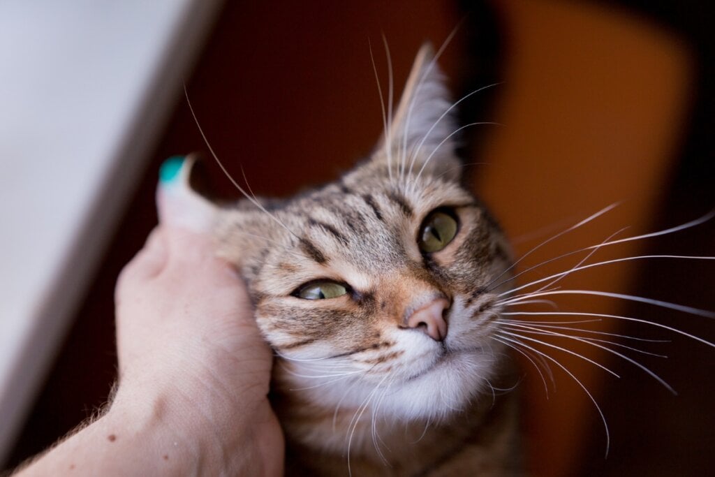 Mão feminina fazendo carinho na cabeça de um gato