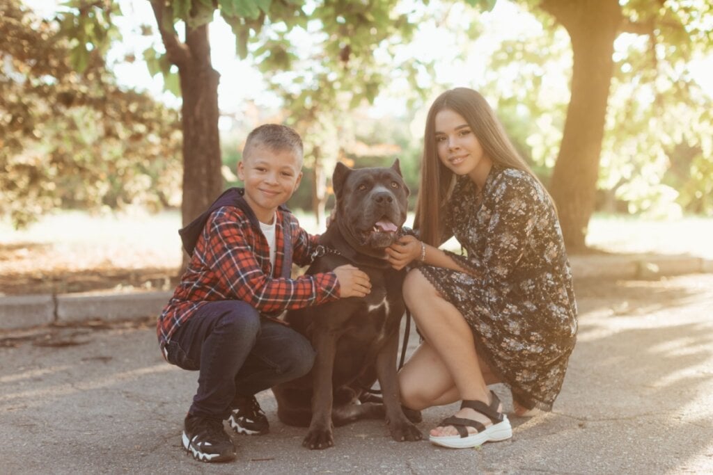 Um menino e uma jovem abraçados com um cachorro da raça cane corso no parque