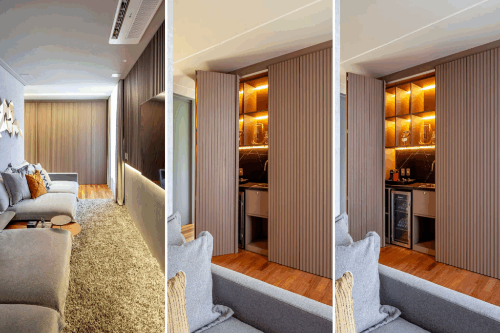 Nos projetos residenciais, o bar deixou de ser apenas um apoio funcional e passou a ocupar um papel mais importante na forma de viver a casa. Ele cria cenários para encontros espontâneos, conversas sem pressa e pausas agradáveis no dia a dia, trazendo charme e personalidade aos ambientes. Seja integrado à área social ou inserido de forma mais discreta, o espaço contribui para tornar a rotina mais leve e convidativa.
