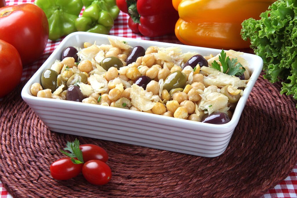Em uma tigela grande, coloque o grão-de-bico cozido, as azeitonas e a cebola em lâminas. Adicione o bacalhau já frio. Regue com o restante do azeite de oliva e o suco de limão. Tempere com sal e pimenta-do-reino. Misture com cuidado para não desmanchar o grão-de-bico nem o peixe. Finalize com a salsinha e leve à geladeira por 30 minutos antes de servir.