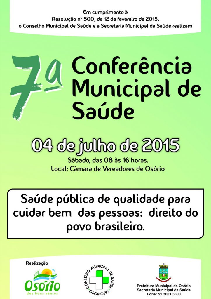 Acontece neste sábado, 04/07, a 7ª Conferência Municipal da Saúde de Osório, na Câmara de Vereadores entre 8 h e 16 horas.