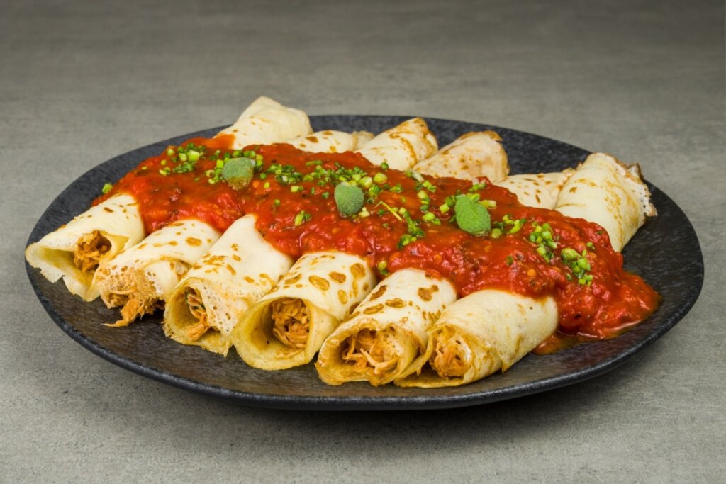 Recheie cada panqueca com o frango e enrole. Disponha as panquecas em um prato ou travessa, regue com o restante do molho de tomate reservado, finalize com cheiro-verde e manjericão fresco para decorar e sirva quente.