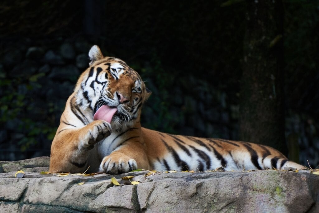 Tanto gatos quanto tigres têm o hábito de se limpar frequentemente usando a língua. Nos bichanos, isso é um comportamento comum de higiene, pois sua língua áspera remove pelos soltos e sujeira. Os tigres fazem o mesmo, limpando sua pelagem após uma refeição ou simplesmente para remover sujeiras do corpo.
