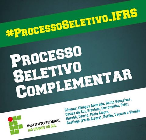 Estão abertas até a próxima segunda-feira, 02 de março de 2015, no site Ingresso do IFRS (www.ingresso.ifrs.edu.br), as inscrições para o Processo Seletivo Complementar para ingresso no primeiro semestre de 2015 nos Câmpus Alvorada, Bento Gonçalves, Caxias do Sul, Erechim, Farroupilha, Feliz, Ibirubá, Osório, Porto Alegre, Restinga (Porto Alegre), Sertão, Vacaria e Viamão do Instituto Federal de Educação, Ciência e Tecnologia do Rio Grande do Sul (IFRS).