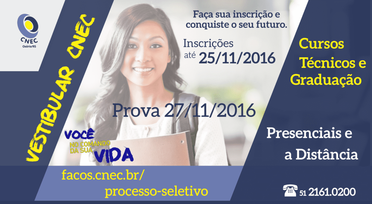 banner-vestibularAs inscrições para o Vestibular de verão CNEC Osório estão abertas até dia 24/11 para cursos presenciais e a distância.