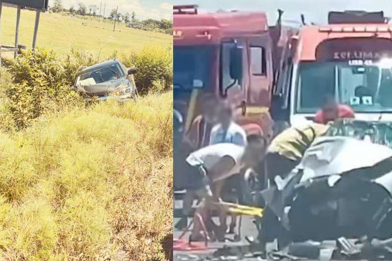 Com a força do impacto, um dos carros foi arremessado em um matagal às margens da rodovia, enquanto o outro ficou parado no meio da via, gerando congestionamento no local.