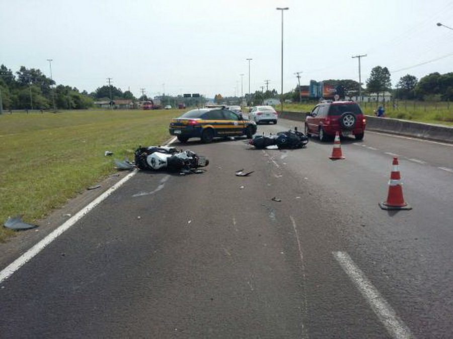 Duas motos esportivas de 1300 cilindradas bateram na traseira de um caminhão, no quilômetro 7 da BR-101