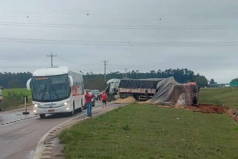 O incidente ocorreu às 13h24min e envolveu duas carretas e um carro, com uma das carretas tombando na pista.