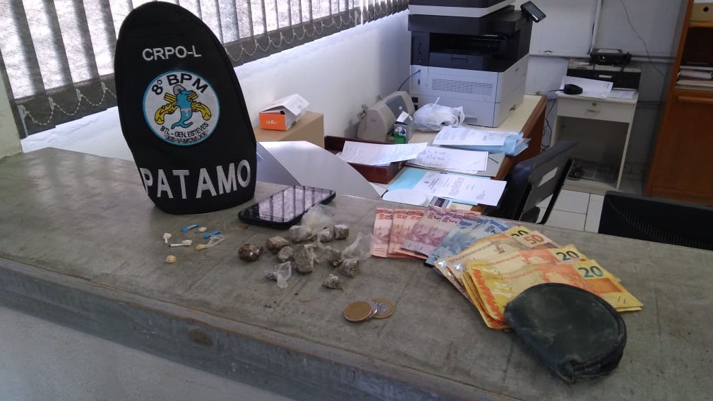 Com ele foi localizada 11 porções de maconha embalada para venda, sete pedras de crack, um aparelho celular e R$ 394,00 em dinheiro.