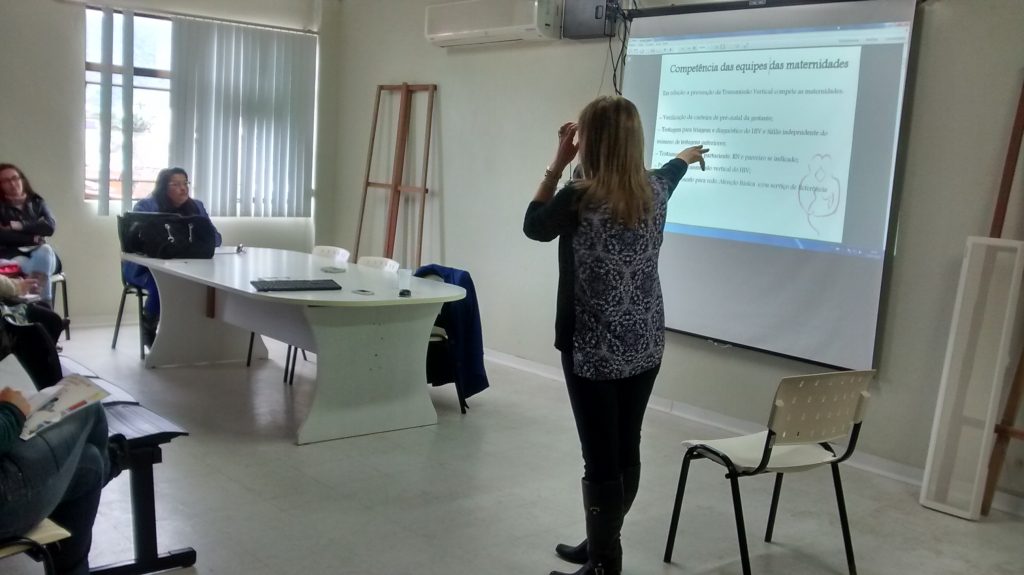 Foi realizada na 4ª feira 23/07 foi uma capacitação com agentes comunitários de saúde sobre transmissão vertical do HIV e Sífilis, proferida pela enfermeira Márcia Spanevelo Gamba Renner. O objetivo é estar atento para diminuir o número de sífilis congênita (bebê que nasce com sífilis porque a mãe não se tratou) e usar profilaxia para o HIV nas gestantes positivas para que o bebê não tenha a doença.