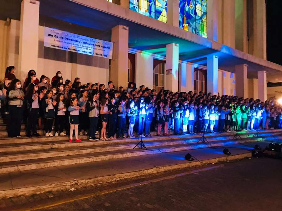 Foram 332 vozes em harmonia nas canções natalinas. Um lindo espetáculo musical e com fogos de artifícios para encantar as famílias dos alunos.