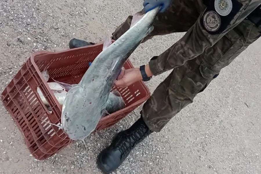 Ao lado dos pescadores fora localizada uma caixa contendo 5 (cinco) exemplares de peixes da espécie Bagre.