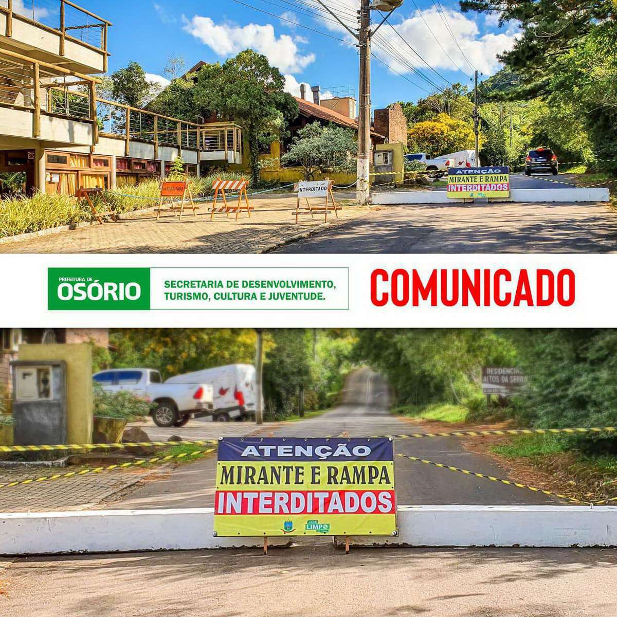 “A secretaria de desenvolvimento, turismo, cultura e juventude de Osório, através do secretário Lucas Azevedo informa que o Mirante da Borússia e a rampa de voo livre continuarão interditados.