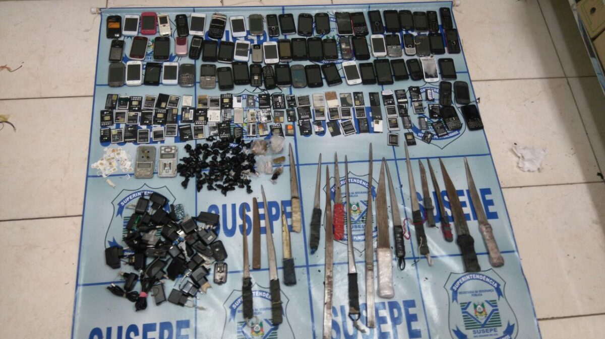 Agentes penitenciários da Susepe fizeram uma revista na galeria A da Modulada de Osório, na manhã desta terça-feira (16). A Operação Vento Norte inspecionou 25 celas, onde estão recolhidos 140 apenados, e apreendeu 68 celulares, 20 estoques, 78 baterias, 88 buchinhas de maconha e 28 carregadores. Alguns detentos tentaram impedir a ação, mas foram contidos pelos agentes.
