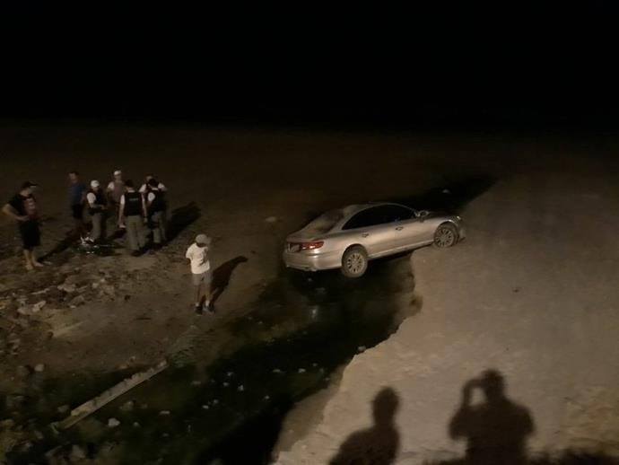Um Hyundai Azera acabou pendurado em um paredão de areia, em meio a um canal de escoamento para o mar, na orla.