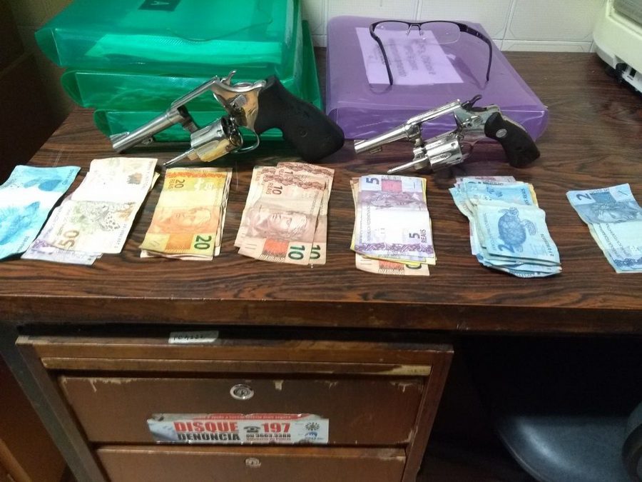 Um homem de 26 anos e um adolescente de 15 foram encaminhados à Delegacia de Polícia. Dois revólveres e o dinheiro roubado foram apreendidos.