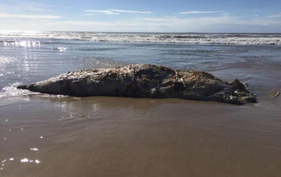 Uma carcaça de baleia foi encontrada, na manhã deste sábado (24), na beira-mar de Xangri-Lá, próximo à guarita 95.