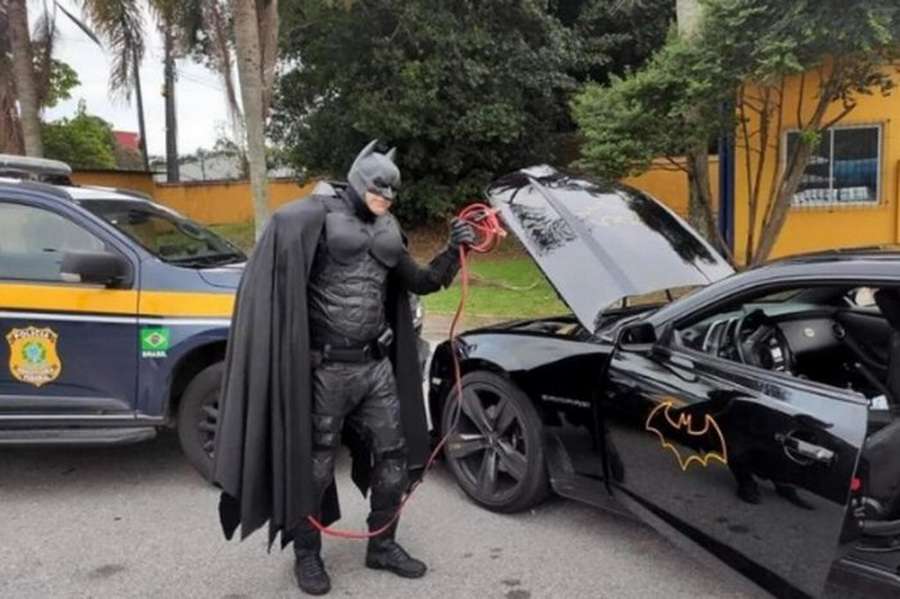 Segundo os policiais, a bateria do “Batmóvel” de Renato Bilbao, um aposentado de 54 anos que incorpora o super-herói em trabalhos voluntários, acabou descarregando durante o trajeto pela BR-101 e precisou de ajuda para seguir viagem.