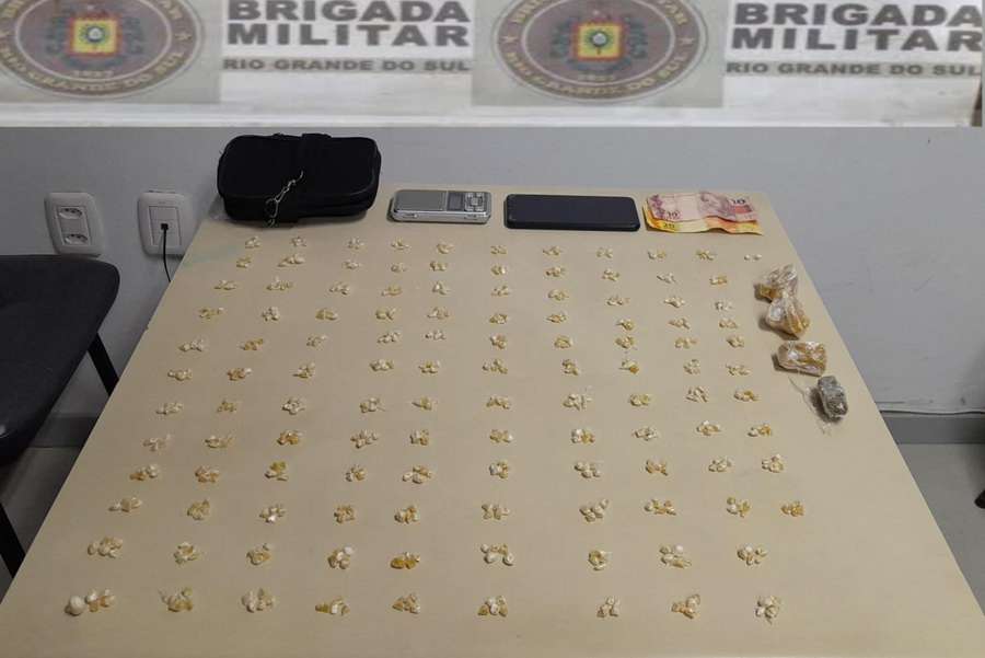 Em Tramandaí, uma mulher de 23 anos foi presa com 592 pedras de crack, outras três pedras grandes da mesma droga, um tijolo de maconha, uma balança de precisão e R$ 30.