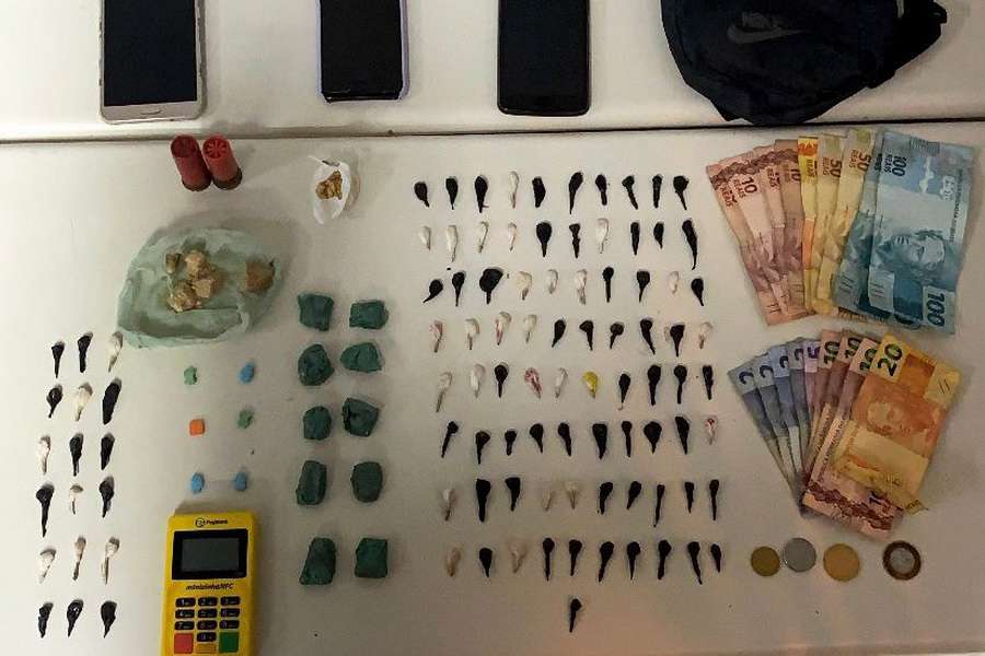 Em menos de 6h, no bairro Centro, munidos de informações sobre a traficância no local, os policiais militares abordaram uma mulher e dois adolescentes, sendo localizados com eles 105 porções de crack, 10 porções de maconha, seis comprimidos de ecstasy, duas munições calibre. 12, uma máquina de cartões e R$ 446.
