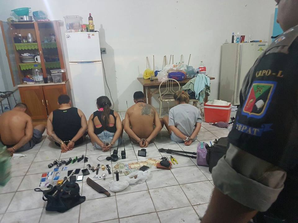 Cinco indivíduos foram presos com duas Eco Sport clonadas, R$ 350, seis aparelhos celulares, 12 cartões de crédito, 44 pneus furtados, dois rádios na frequência da BM e sete relógios. Além de dois aparelhos bloqueadores de sinal veicular (Jammer).