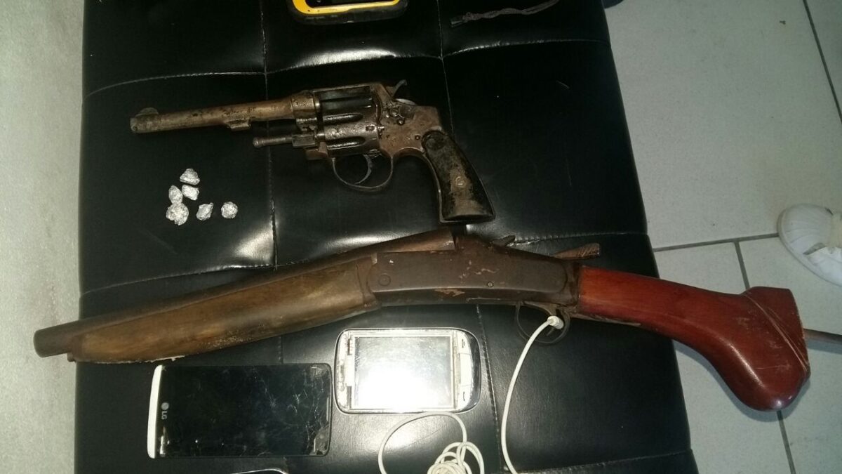Em averiguação nas proximidades da residência, uma pessoa tentou fugir correndo, mas foi alcançado pelos policiais. Na casa foram apreendidos um revólver calibre 38 municiado, uma garrucha calibre 20, diversos aparelhos celulares, seis pedras de crack, uma TV 32 polegadas enrolada em um cobertor e demais objetos sem procedência.