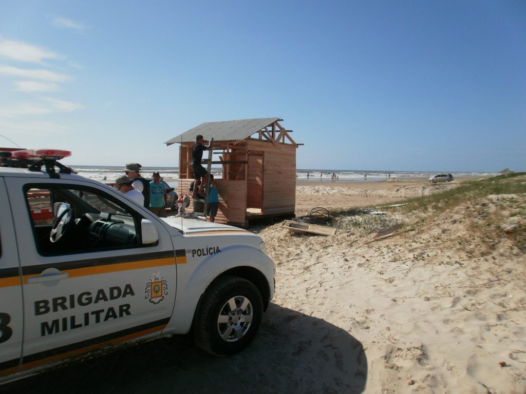 A guarnição ao chegar próximo a guarita 189, no bairro Costa do Sol, realizou vistoria, sendo flagrado cinco pessoas construindo uma pequena edificação de madeira próximo as Dunas. O proprietário não apresentou nenhum tipo de licença ambiental para construção na Faixa de Praia no município de Cidreira-RS, expedida pela Secretaria Municipal do Meio Ambiente, contrariando assim, as legislações ambientais vigentes.