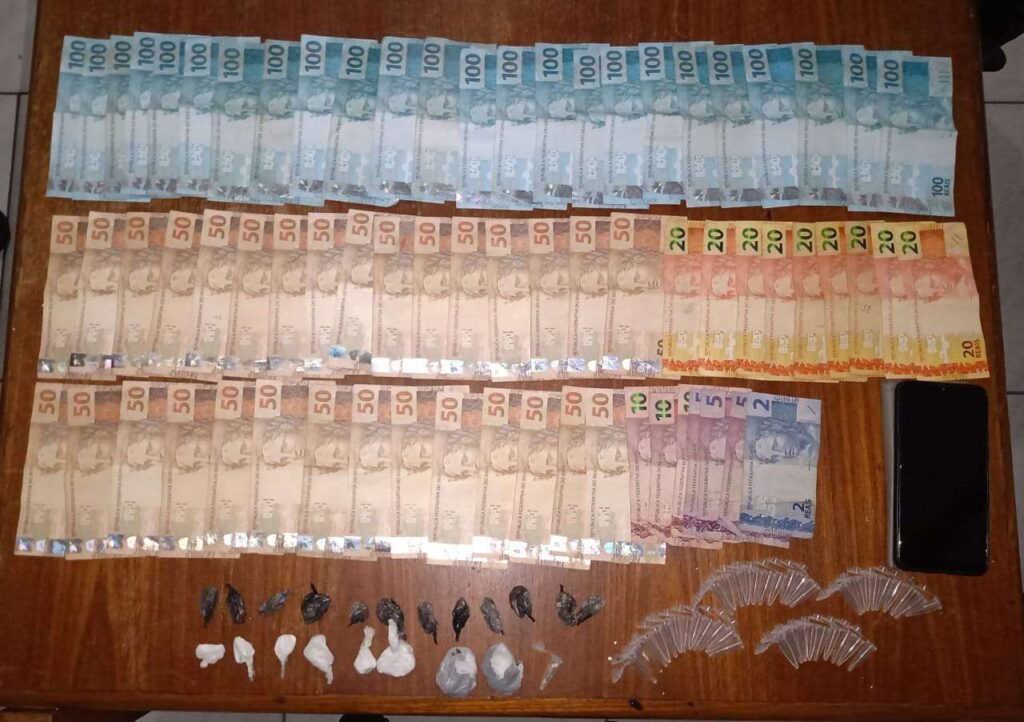 Ao realizar a abordagem, o indivíduo tentou fugir, mas foi contido pelos PMs. Com ele foram localizadas 18 porções de cocaína, duas porções de maconha, diversos pinos para drogas, vazios, e o dinheiro apreendido.