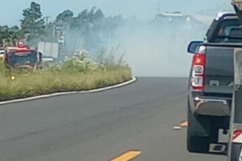 O caso ocorreu por volta das 13h30min desta segunda-feira e o trânsito de veículos precisou ser controlado devido à baixa visibilidade causada pela fumaça.