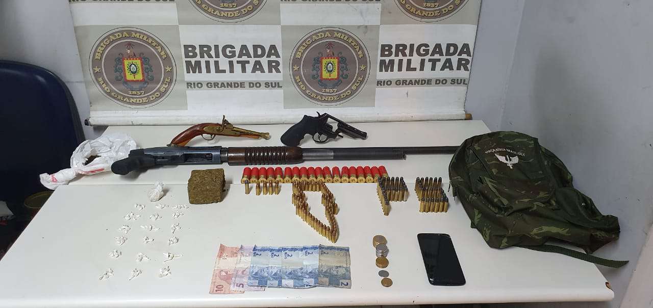 Houve a apreensão de 133 munições de calibres variados mais uma espingarda calibre 12, um revólver calibre 38 e uma garrucha, além de 190 gramas de maconha, 100 pedras de crack, um telefone celular e R$ u 38,35 em dinheiro, além de uma mochila com estampa camuflada.