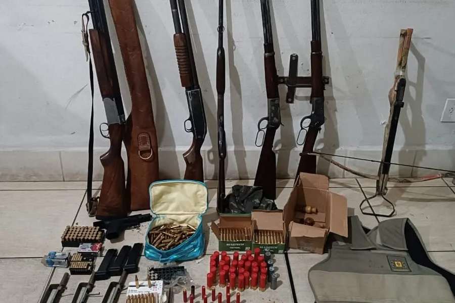 No interior do sítio e no galpão da propriedade foram encontrados petrechos de caça, seis apitos para marrecas e pombas, 12 cartuchos calibre 357, 398 cartuchos cal 556, 60 cartuchos cal 762, 56 cartuchos cal 36, 61 cartuchos cal 22, 48 cartuchos cal 44, 37 cartuchos cal 12, um colete balístico da Brigada Militar e capa, uma besta com um dardo e 3 trabucos de metal.
