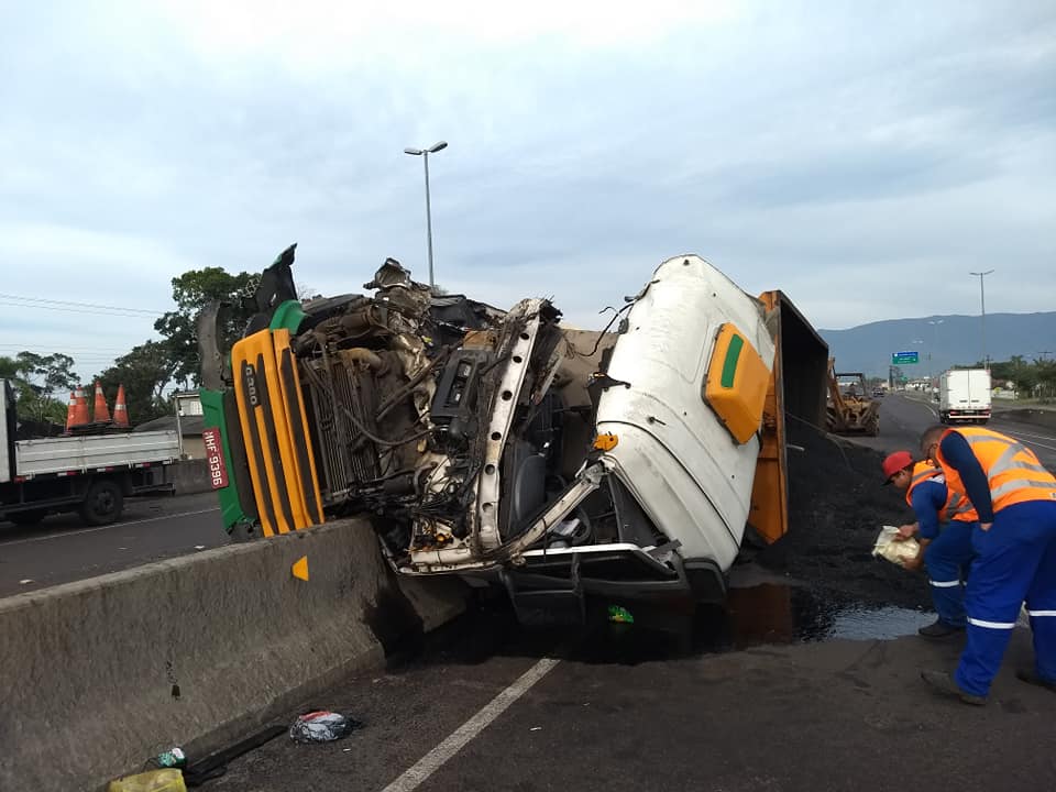 O motorista perdeu o controle do veículo e bateu na mureta central, no sentido Osório-Torres, espalhando a carga na rodovia.
