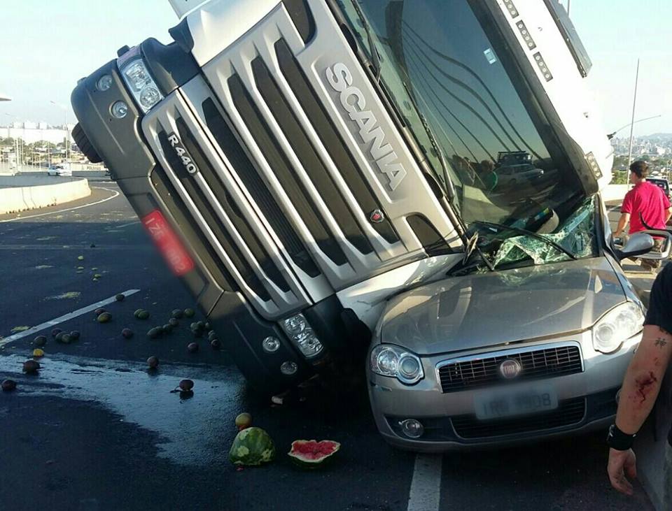 Um acidente envolvendo um Fiat Siena e um caminhão com placas de Santo Antônio da Patrulha, carregado de frutas, bloqueou parte da BR-448, em Porto Alegre, nesse domingo. A carreta acabou tombando sobre o veículo em uma curva.
