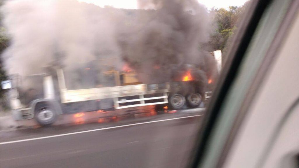 Um caminhão pegou fogo, na tarde desta quinta-feira, no km 07 da Freeway, em Osório.