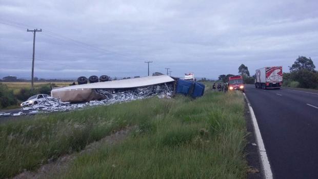 Uma carreta carregada de surdinas tombou por volta das 7h da manhã desta sexta-feira (17) no quilômetro 459 da BR-101, entre Torres no Rio Grande do Sul e Passo de Torres, em Santa Catarina.