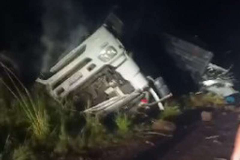 O caminhão tombou às margens da rodovia e, em seguida, um princípio de incêndio foi registrado próximo à cabine.