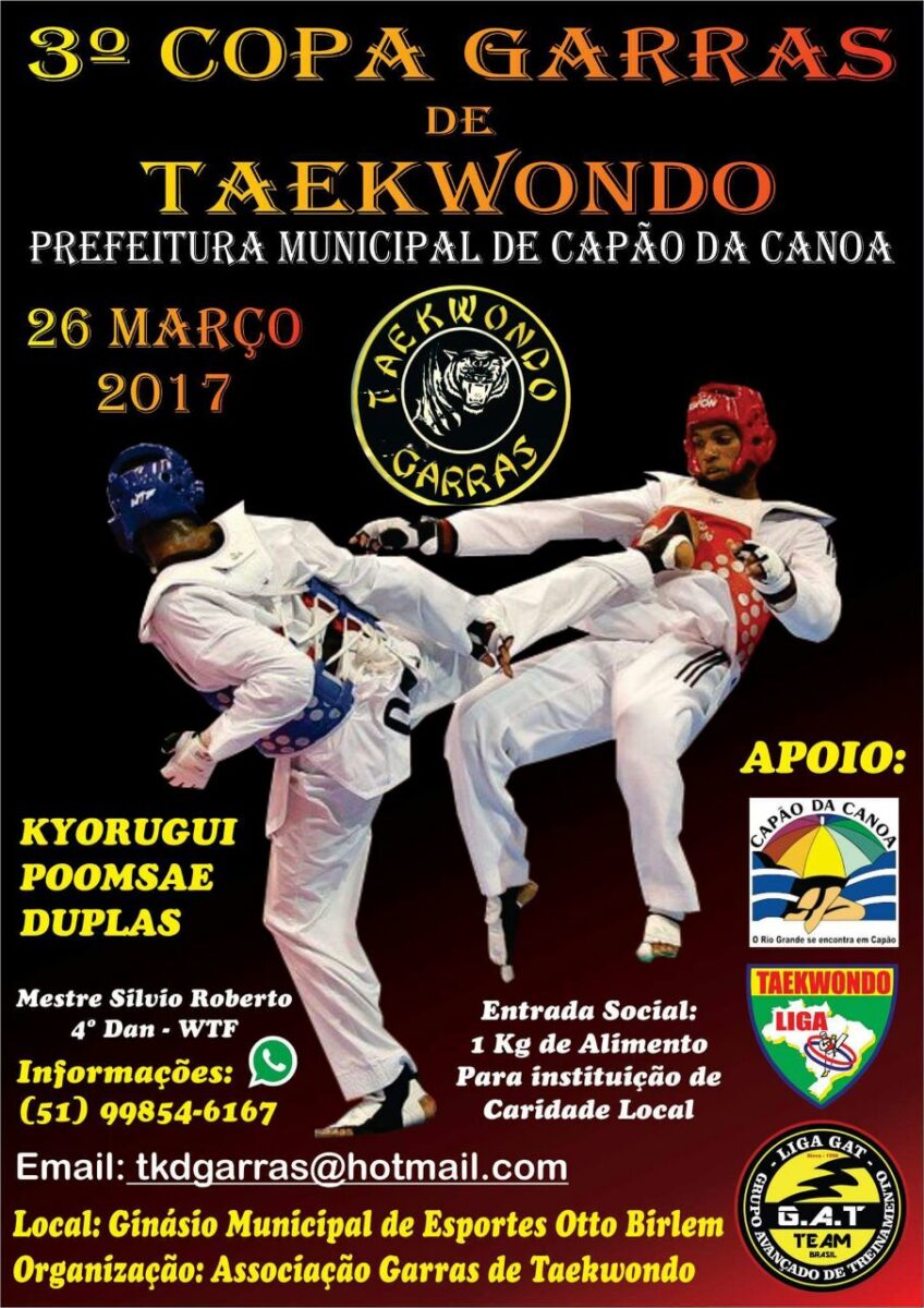 Conforme informações do Departamento de Esportes, órgão vinculado a Secretaria de Turismo, Indústria e Comércio, no dia 26 de março, a partir das 9h,será realizado a 3ª Copa Garras de Taekwondo, no Ginásio Municipal de Esportes Otto Birlem, com a presença do Mestre Silvio Roberto do 4º Dan-WTF.