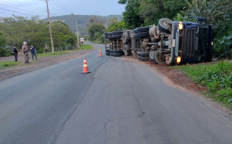 Um carreta carregada com farelo de trigo, tombou no início da manhã desta quinta-feira (23), na ERS-030.