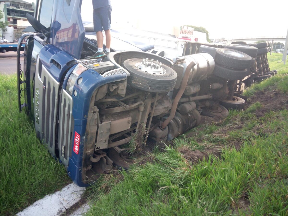 Uma carreta tombou no final da tarde dessa quarta-feira (16), no canteiro central da lateral da BR-101, em Osório.