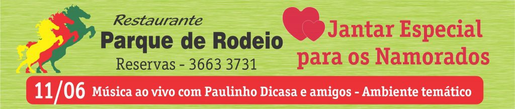 A Churrascaria Parque de Rodeio terá um jantar especial para os namorados neste sábado (11). Com abertura prevista para às 20h, os casais serão recepcionados em um ambiente temático e música ao vivo com Paulinho Dicasa e amigos.